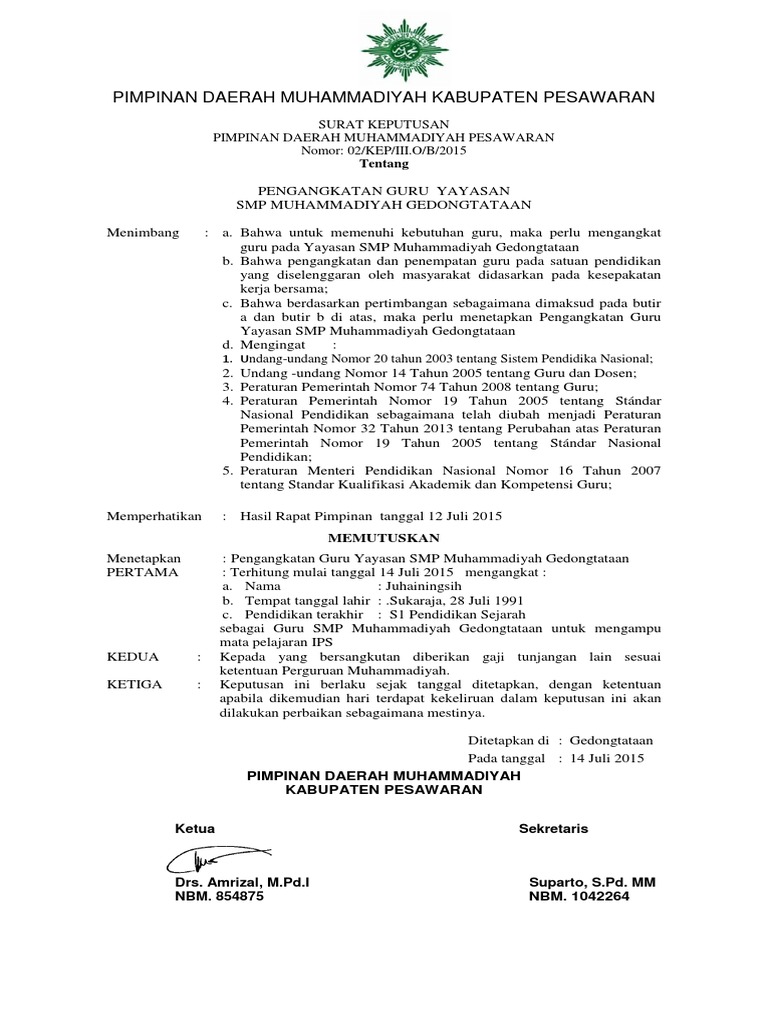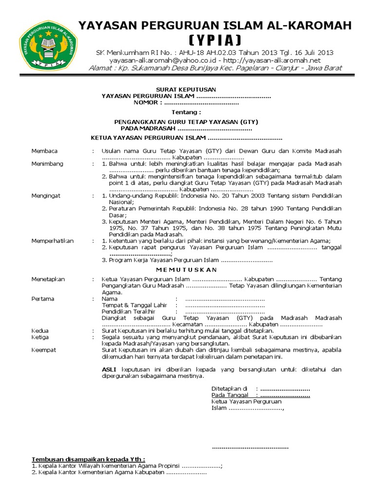 Keputusan musyawarah pengurus yayasan tarbiyatul munawwarah tentang pengankatan guru tetap yayasan (gty) memutuskan menetapkan : Contoh sk pengangkatan kepala sekolah tk oleh yayasan doc. Karena sk guru tetap yayasan (gty) ini terkadang diperlukan oleh guru yang bersangkutan. Pegawai guru tetap yayasan (gty). Contoh sk guru tetap yayasan. Sk yang diminta adalah yang 2 tahun terakhir, di scan dan digabung ke format pdf. Bagi rekan guru maupun kepala. Kemudian ketua yayasan harus menerbitkan sk pengangkatan kepala sekolah. Hidayah priode 2015 2020 dipandang perlu mengangkat pengurus yayasan. Desa sigentong kecamatan wanasari kabupaten brebes. Ya yayasan perguru perguruan an islam alalkaromah. Sk ini sangat berguna bagi bapak/ibu guru yang mau mengusulkan aneka tunjangan dan kesejahteraan guru yayasan.maka bapak/ibu guru harus menyimpannya dengan baik karena sebagi tanda bukti telah diangkat menjadi guru tetap yayasan(gty). Tugas dan wewenang guru adalah bertanggung jawab terhadap assalamu'alaikum sahabat pendidikan dimanapun kalian berada.