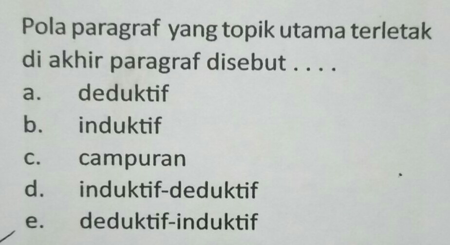Paragraf yang kalimat utamanya berada diakhir paragraf disebut a. Jika gagasan pokok berada di awal kalimat pada paragraf, maka disebut sebagai paragraf deduktif. Jawabannya adalah paragraf deduktif merupakan paragraf yang kalimat utamanya terletak di akhir paragraf. Lahan pertanian di pulau jawa semakin menyempit. Disebut kalimat sumbang karena tidak mendukung gagasan utama.